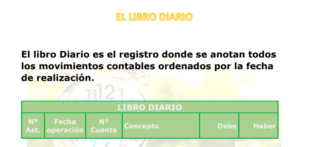 - Libro Diario: El libro diario muestra los movimientos de todas las cuentas por cada asiento que recoge cada hecho contable. Automáticamente de realizar el apunte en el libro diario (asiento contable), se reflejara en el libro mayor.