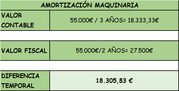 • Adquiere una máquina a principios de año en 55.000 €, que amortizará en 3 años. Fiscalmente amortizará la máquina en 2 años.