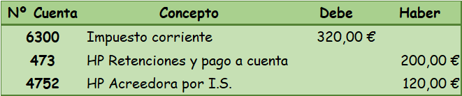 - Gasto por impuesto corriente: Se recoge en la cuenta (6300) Impuesto corriente. Recoge la cantidad que satisface la empresa como consecuencia de las liquidaciones fiscales del impuesto relativas a un ejercicio.