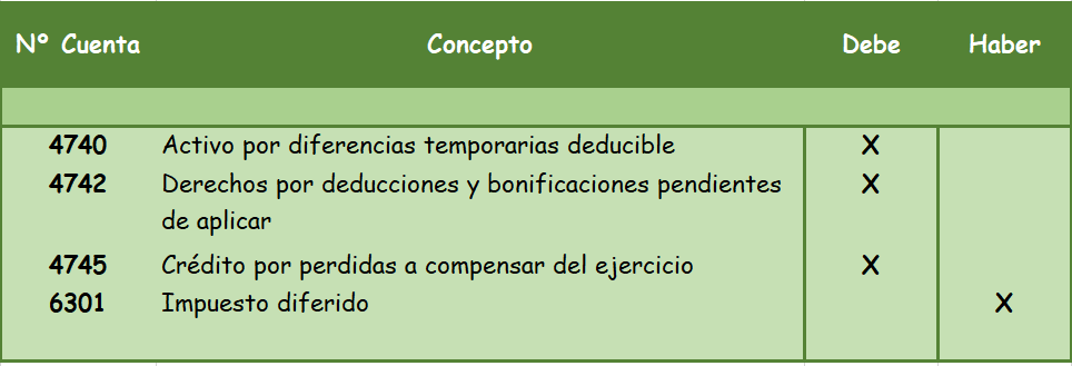 - Gasto por impuesto diferido: Se recoge en la cuenta (6301) Impuesto diferido. recoge el efecto impositivo de determinadas operaciones que supondrán mayores o menores cantidades a pagar o recibir en el futuro.