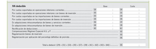 Para la mayoría de autónomos, bastará con rellenar estas casillas en este bloque. Deberás calcular la base imponible de todas las compras corrientes de tu negocio (teniendo en cuenta qué gastos son deducibles) y la cuota del IVA resultante.