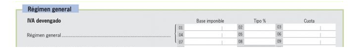 En las tres primeras líneas se harán constar las bases imponibles gravadas, en cada caso, con los tipos del 4%, 10% ó 21%; el tipo aplicable y las cuotas resultantes.