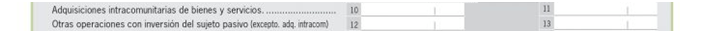 Casillas 10 y 11. En el espacio reservado a las «adquisiciones intracomunitarias de bienes y servicios”, se harán constar las bases imponibles gravadas, correspondientes al total de adquisiciones intracomunitarias de bienes y servicios realizadas en el período de liquidación, y la cuota resultante.