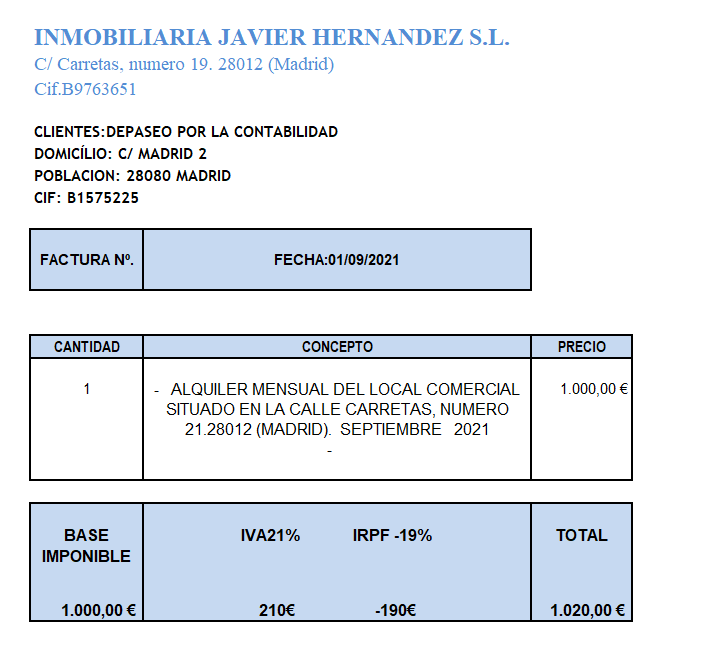 Esta factura nos la emitirá el propietario del local (arrendador), si os fijáis en la misma, el precio que deberíamos pagar de alquiler seria 1000€ + 210€ IVA=1210€, pero en realidad al arrendador le estamos abonando la cuantía de 1020€.