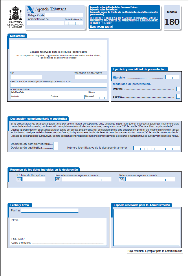 Hay que tener en cuenta y recordar que casi todos los impuesto trimestrales, tienen su versión anual. En este caso estamos hablando del modelo 180 el cual presentamos del dia 1 al 31 de enero y es el resumen de las 4 presentaciones que hemos realizado en el modelo 115