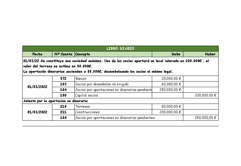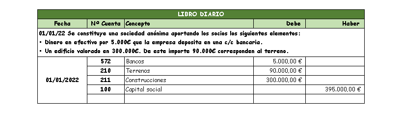 El primer paso contable, es realizar un asiento que refleje la entrada del capital social de la sociedad a través de la aportación de los socios. La aportación puede ser dineraria (en cuyo caso entrará Bancos o Caja) o no dineraria, en cuyo caso se dará de alta el activo aportado por el socio.